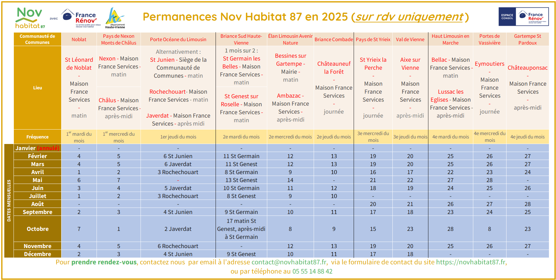 Par ailleurs, la Communauté de communes Ouest Limousin ayant choisi en 2025 de ne pas poursuivre sa participation à Nov Habitat 87, la permanence de Cussac est supprimée et les usagers de ce territoire ne peuvent plus être renseignés par nos conseillers. Si vous êtes dans cette situation, vous êtes invités à contacter la Communauté de communes pour connaître la marche à suivre.